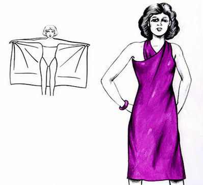 5. Сложите наряд пополам вдоль, чтобы лицевая сторона оказалась внутри. Оберните его вокруг талии, на правом боку завяжите двойной узел. Один слой отогните наверх над грудью, а затем соедините кончики верхней части и завяжите на двойной узелок под рукой.
