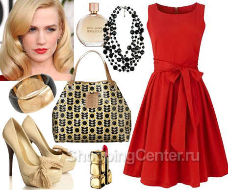 Кремовые или чёрные босоножки, или туфли-лодочки на каблуке – идеальная обувь к такому платью. Для создания эффектных нарядов вы можете надеть короткое красное платье с туфлями золотистого или платинового оттенка.