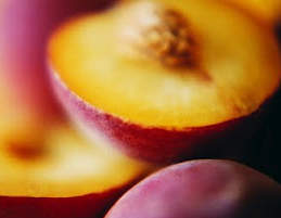 5 персиков (или крупных нектаринов), 200 грамм нежирного творога, 100 грамм печенья, по вкусу имбирь и коньяк, немного лимонного сока.