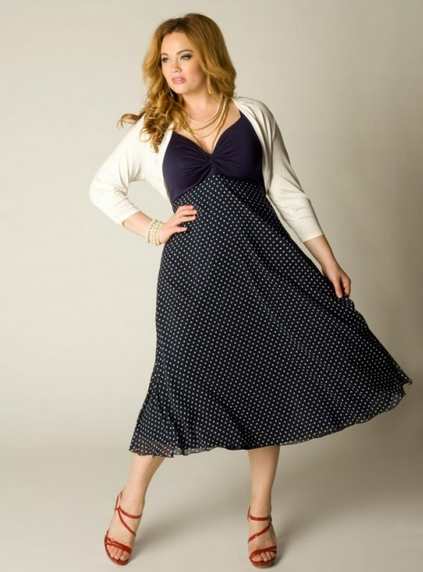 Интересно смотрятся на полных девушках модели с завышенной линией талии, горошинки на которых будут разного размера. Такие платья будут грамотно скрывать излишнюю полноту.