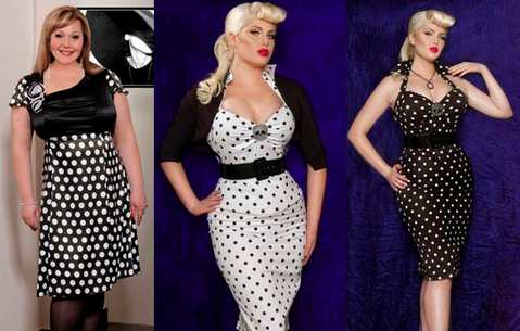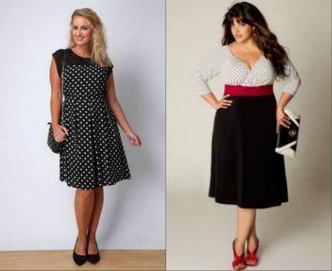 Полным девушкам лучше всего выбирать модели в мелкий горошек, расположенный на тёмном фоне. Хорошо в данном случае будет смотреться чёрное или тёмно-синее платье в белый горошек. Девушки с пышными формами могут смело выбирать горошинки различных форм, но осторожнее следует быть при выборе овальной формы: она обязательно должна быть вытянута именно вверх, а не в стороны.